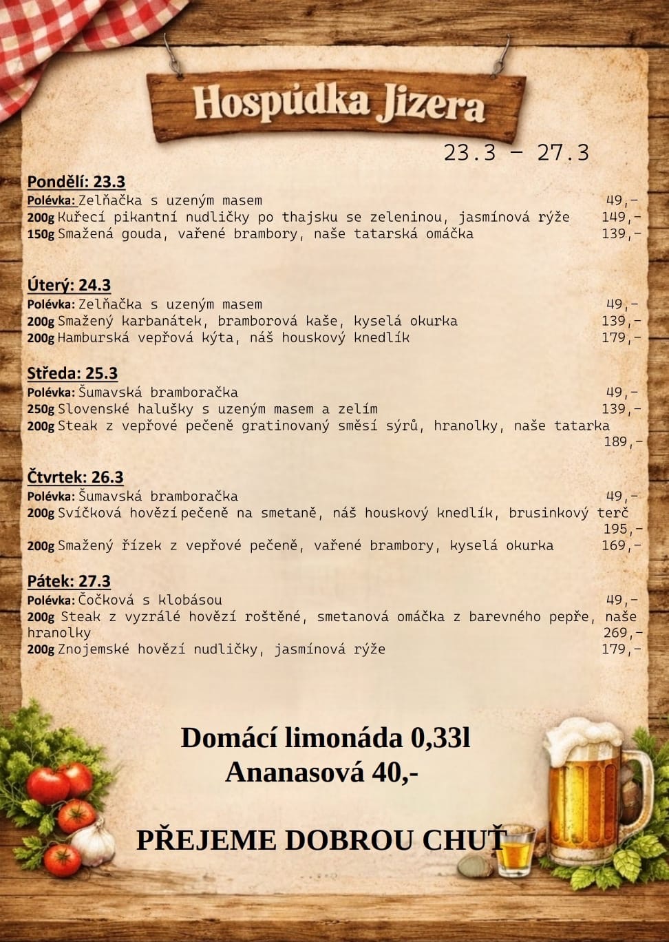 Aktuální menu. Oběd si můžete vychutnat u nás nebo odnést v menu boxu s sebou domů.